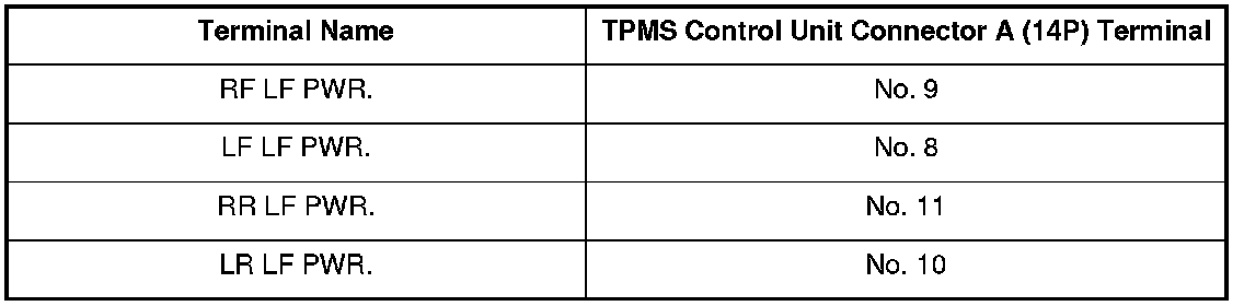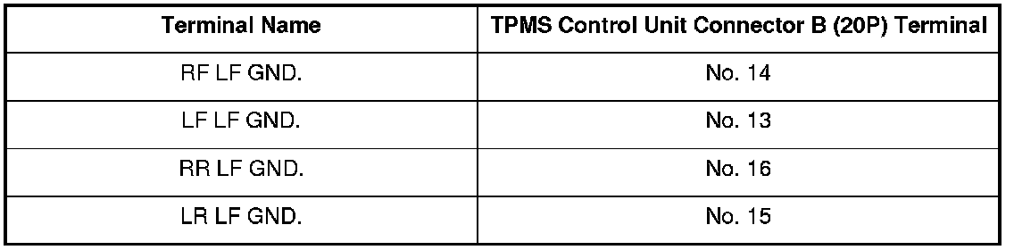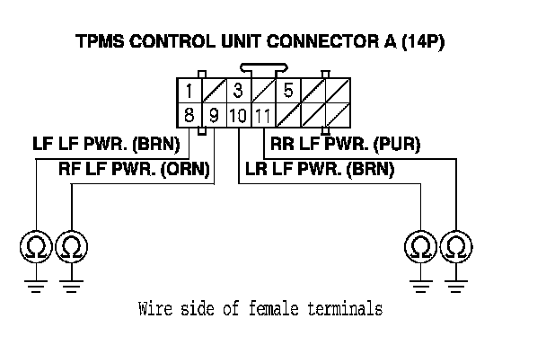 7. Check for continuity between body ground and the appropriate TPMS control unit connector A (14P) terminal.