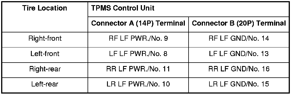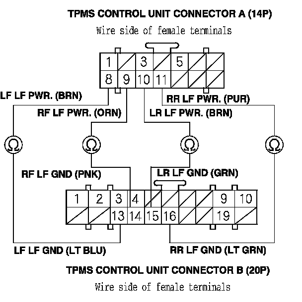 10. Check for continuity between the appropriate TPMS control unit connector A (14P) and connector B (20P) terminals.