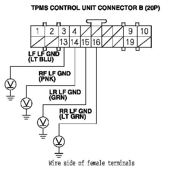 14. Measure the voltage between body ground and the appropriate TPMS control unit connector B (20P) terminal.