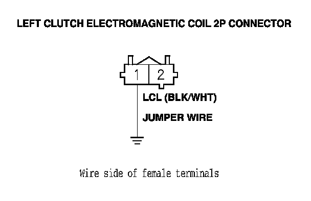 10. Remove the jumper wire from the left clutch electromagnetic coil 2P connector terminal No. 1.