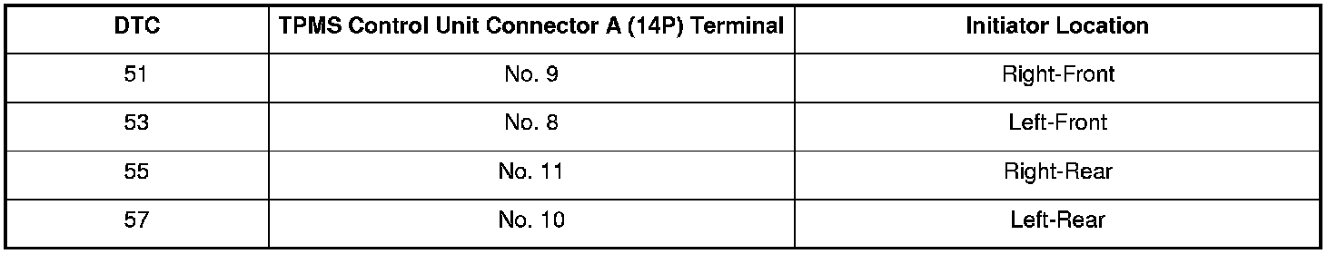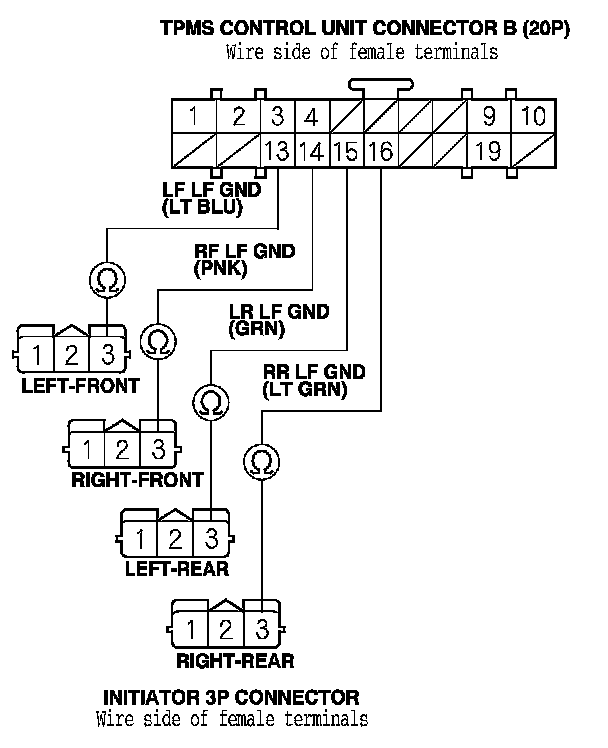 19. Check for continuity between the appropriate TPMS control unit connector A (14P) terminal and appropriate initiator 3P connector terminal No. 1 (see table).