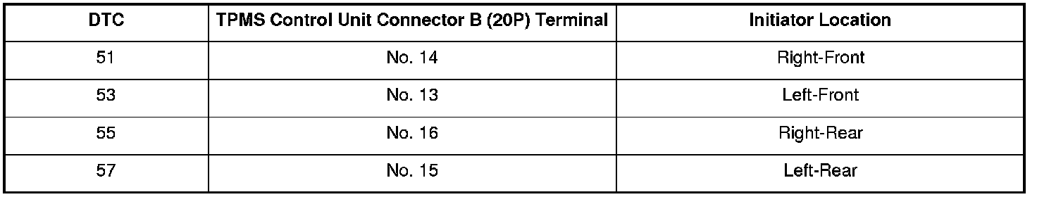 21. Check for continuity between the appropriate TPMS control unit connector B (20P) terminal and appropriate initiator 3P connector terminal No. 2 (see table).
