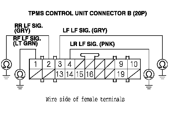 22. Check for continuity between body ground and the appropriate TPMS control unit connector B (20P) terminal (see table).