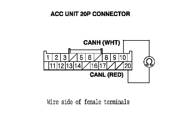 8. Measure the resistance between ACC unit 20P connector terminals No. 10 and No. 20.