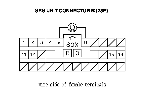 12. Measure the resistance between SRS unit connector B (28P) terminals No. 5 and No. 6. There should be an open circuit or at least 1 MOhms.