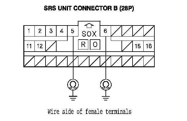 13. Measure the resistance between SRS unit connector B (28P) terminal No. 5 and body ground, and between terminal No. 6 and body ground. There should be an open circuit or at least 1 MOhms.