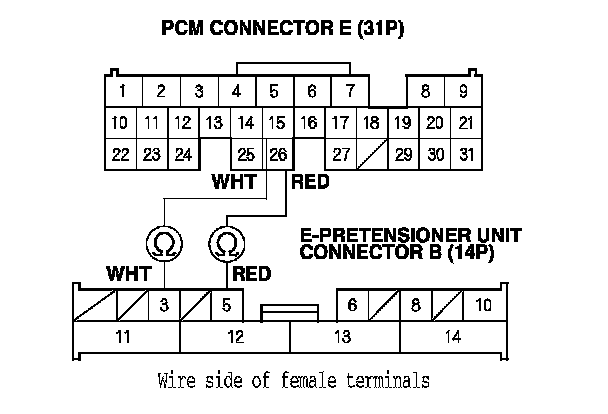 8. Measure the resistance between E-pretensioner unit connector B (14P) terminal No. 3 and PCM connector E (31P) terminal No. 15, and between E-pretensioner unit connector B (14P) terminal No. 5 and PCM connector E (31P) terminal No. 26.