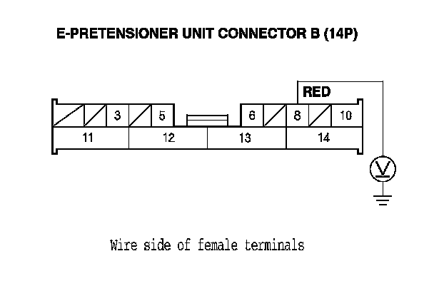6. Measure the voltage between E-pretensioner unit connector B (14P) terminal No. 8 and body ground. There should be battery voltage.