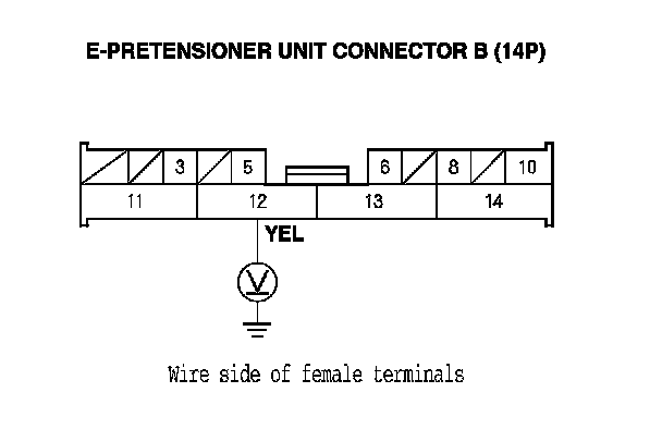 7. Measure the voltage between E-pretensioner unit connector B (14P) terminal No. 12 and body ground. There should be battery voltage.