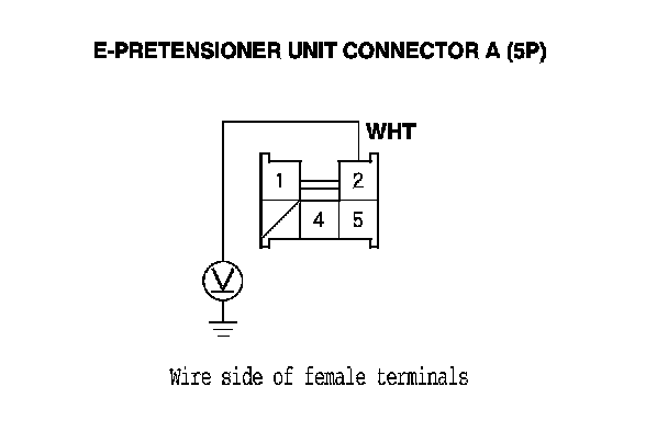 9. Measure the voltage between E-pretensioner unit connector A (5P) terminal No. 2 and body ground. There should be battery voltage.