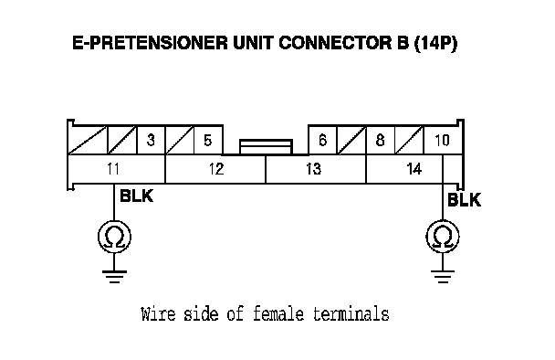 11. Measure the resistance between E-pretensioner unit connector B (14P) terminal No. 10 and body ground, and between E-pretensioner unit connector B (14P) terminal No. 11 and body ground. There should be less than 1.0 Ohms.