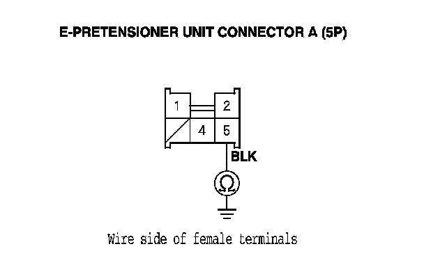 12. Measure the resistance between E-pretensioner unit connector A (5P) terminal No. 5 and body ground. There should be less than 1.0 Ohms.