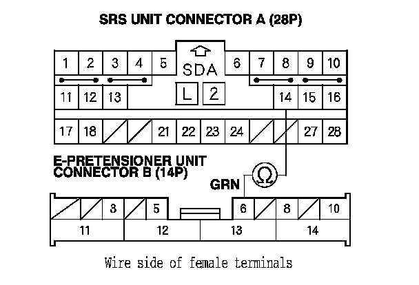 NO - Open between SRS unit connector A (28P) terminal No. 14 and E-pretensioner unit connector B (14P) terminal No. 6.