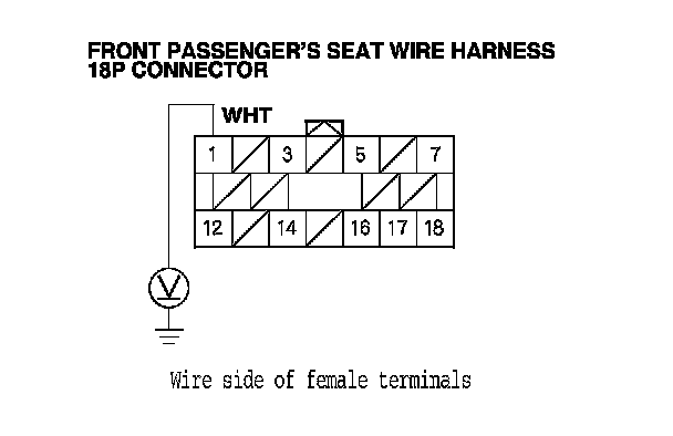6. Measure the voltage between front passenger's seat wire harness 18P connector terminal No. 1 and body ground. There should be battery voltage.