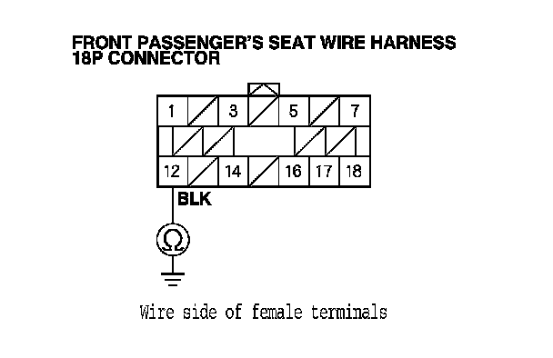8. Measure the resistance between front passenger's seat wire harness 18P connector terminal No. 12 and body ground. There should be less than 1.0 Ohms