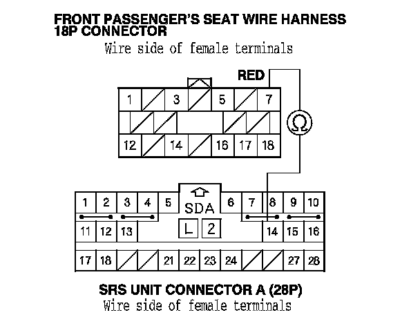 12. Measure the resistance between SRS unit connector A (28P) terminal No. 14 and front passenger's seat wire harness 18P connector terminal No. 7. There should be less than 1.0 Ohms.