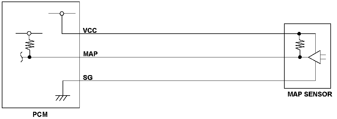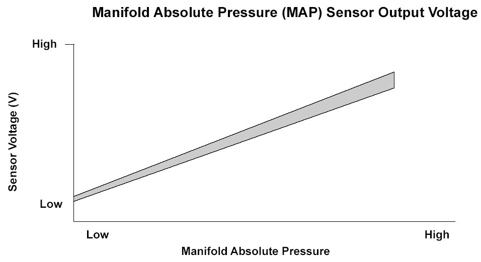 The manifold absolute pressure (MAP) sensor senses manifold absolute pressure (vacuum) and converts it into electrical signals. The MAP sensor outputs low signal voltage at high vacuum (throttle valve closed) and high signal voltage at low vacuum (throttle valve wide open). If the signal voltage from the MAP sensor is a set value, the powertrain control module (PCM) detects a malfunction and stores a DTC.