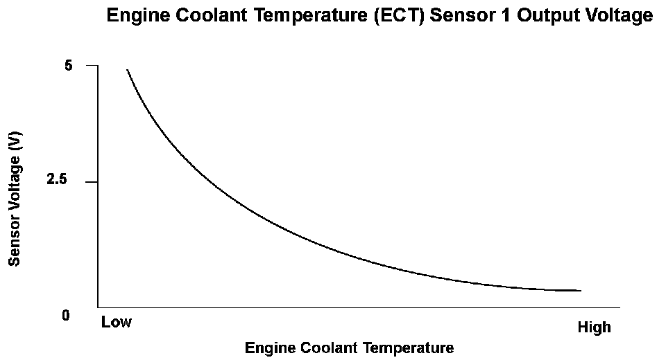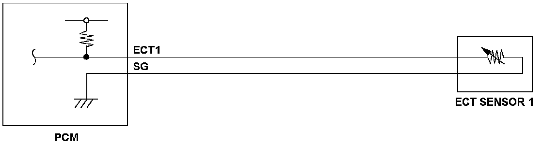 Engine coolant temperature (ECT) sensor 1 is used for air/fuel ratio feedback control, ignition timing control, idle speed control, and other functions. The ECT sensor 1 resistance varies depending on the engine coolant temperature. As the engine coolant cools, the ECT sensor 1 resistance increases, and the powertrain control module (PCM) detects a high signal voltage. As the engine coolant warms, the ECT sensor 1 resistance decreases, and the PCM detects a low signal voltage. If the ECT sensor 1 output voltage is a set value when the engine coolant temperature is low, the PCM detects a malfunction and stores a DTC.
