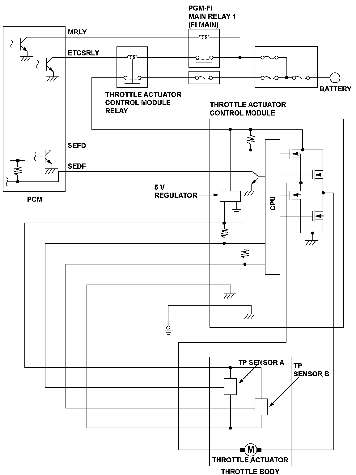 Throttle position (TP) sensor A is a semiconductor type, and it is attached to the throttle body and shaft to determine throttle valve position. The throttle valve position signal from TP sensor A is transmitted to the throttle actuator control module for target position feedback control, then to the powertrain control module (PCM) as an actual throttle valve position signal. If the signal from TP sensor A is more than a fixed value for a set time, the throttle actuator control module detects a malfunction and sends the malfunction data to the PCM. When the PCM receives the malfunction data from the throttle actuator control module, the PCM detects a TP sensor A malfunction and stores a DTC.