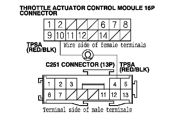 12. Check for continuity between throttle actuator control module 16P connector terminal No. 10 and C251 connector (13P) terminal No. 4.