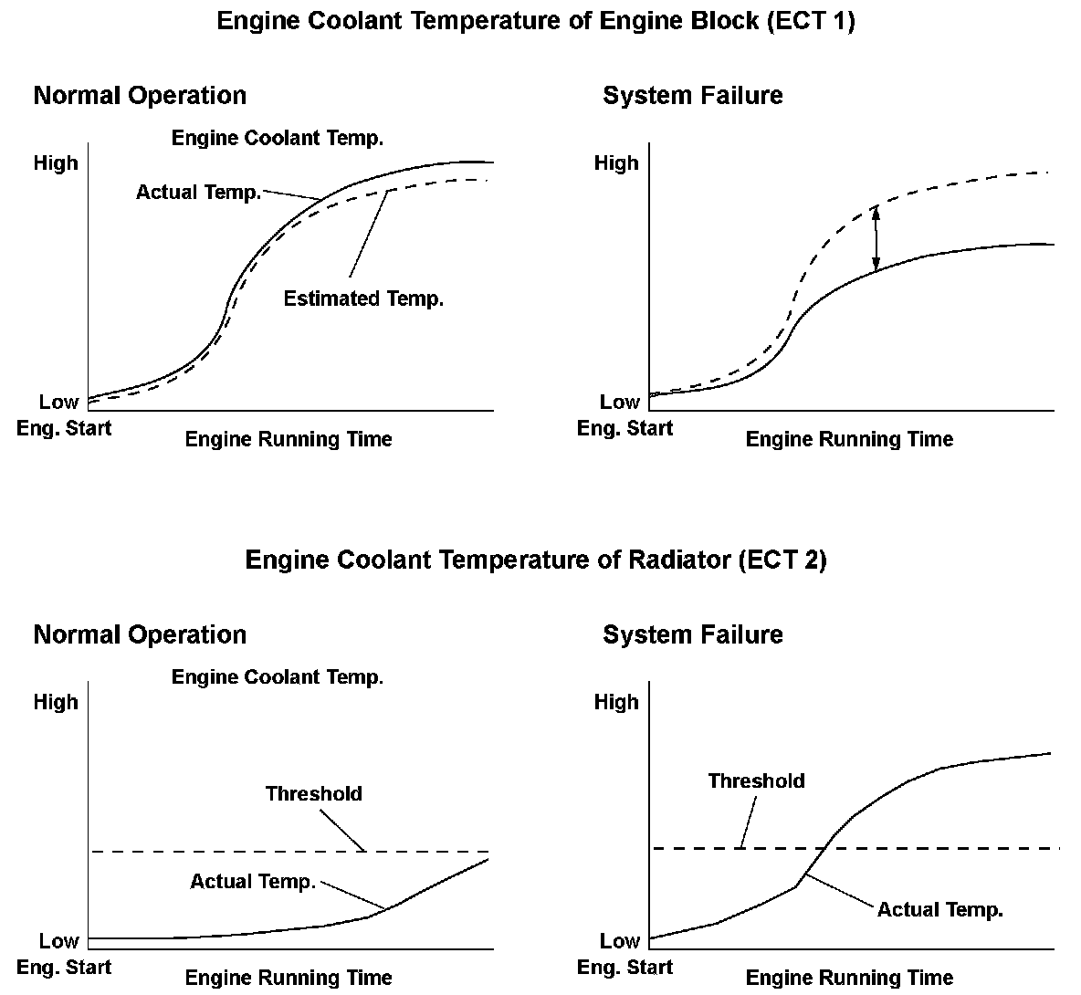 If the difference between the current measured coolant temperature at the radiator (ECT 2) and the initial coolant temperature at the radiator (ECT 2) is at least 18 °F (10 °C) when the estimated coolant temperature at the engine (ECT 1) reaches 160 °F (72 °C), a malfunction is detected (thermostat stuck open);or if the coolant temperature at the radiator (ECT 2) only reaches 67 °F (20 °C), a malfunction is detected (thermostat malfunction).