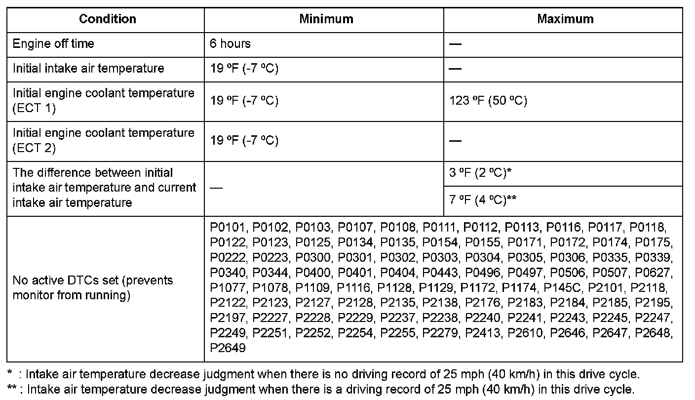 When a malfunction is detected during the first drive cycle with the ECT and IAT at engine start-up within the specified temperature range, a Pending DTC is stored in the PCM memory. If the malfunction returns in the next (second) drive cycle with the ECT and IAT at engine start-up within the specified temperature range, the MIL comes on and a Confirmed DTC and the freeze data are stored.