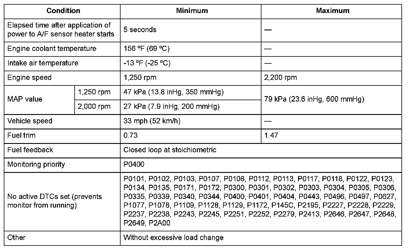 The rear air/fuel ratio (A/F) sensor (bank 1, sensor 1) has a linear signal output in relation to the oxygen concentration. The powertrain control module (PCM) computes the air/fuel ratio from the rear A/F sensor output voltage and uses fuel feedback control to improve exhaust emissions. The PCM compares the response characteristics against the rear A/F sensor output. If the total rear A/F sensor output is a specified value for a specified time, the PCM detects a deteriorated response and stores a DTC.