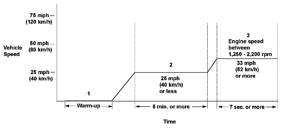 3. Drive immediately at a steady speed of 33 mph (52 km/h) or more and engine speed between 1,250 - 2,200 rpm for at least 7 seconds.