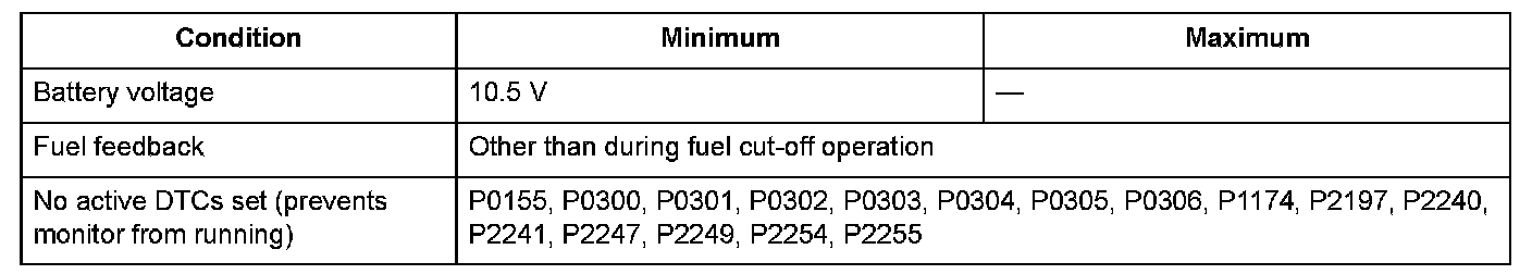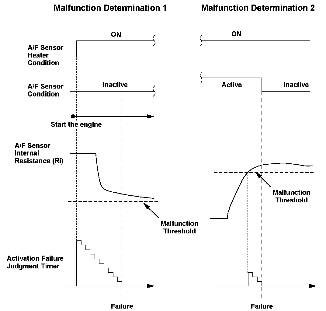1. When the front A/F sensor does not activate for a set time after the front A/F sensor heater is turned on (with high front A/ F sensor internal resistance), a malfunction of the front A/F sensor heater is detected, and a DTC is stored.