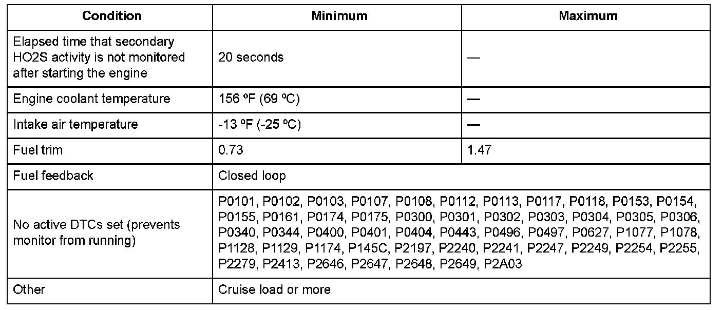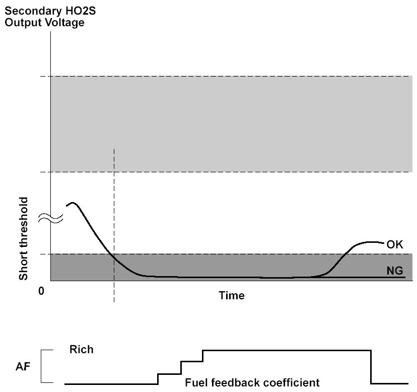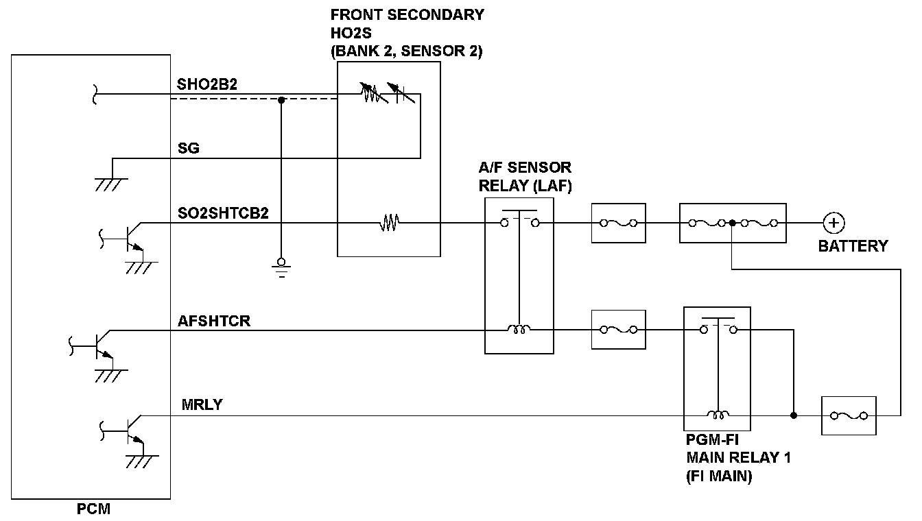 The front secondary heated oxygen sensor (HO2S) (bank 2, sensor 2) detects the oxygen content in the exhaust gas downstream of the three way catalytic converter (TWC) during stoichiometric air/fuel ratio feedback control. The front secondary HO2S controls the air/fuel ratio from the front A/F sensor output voltage so that the TWC efficiency is optimized. After current is applied to the front secondary HO2S heater, if the front secondary HO2S output continues to be low (lean) during feedback control, the powertrain control module (PCM) detects a malfunction and stores a DTC.