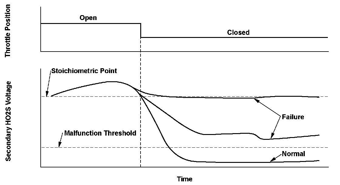 The front secondary heated oxygen sensor (HO2S) (bank 2, sensor 2) detects the oxygen content in the exhaust gas downstream of the three way catalytic converter (TWC) during stoichiometric air/fuel ratio feedback control. The front secondary HO2S controls the air/fuel ratio with the front A/F sensor output voltage to optimize the TWC's efficiency. When the front secondary HO2S does not change during lean A/F when the throttle is closed, after full current is applied to the secondary HO2S heater, and output remains within the specified range continuously, the powertrain control module (PCM) detects a malfunction and stores a DTC.