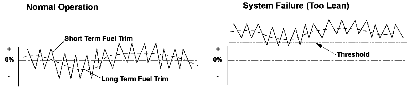The powertrain control module (PCM) detects the oxygen content in the exhaust gas from the rear air/fuel ratio (A/F) sensor (bank 1, sensor 1) signal voltage, and it uses fuel feedback control to maintain the optimal air/fuel ratio. The air/fuel ratio coefficient for correcting the amount of injected fuel is the short term fuel trim. The PCM varies short term fuel trim continuously to keep the air/fuel ratio close to the stoichiometric ratio for all driving conditions. Long term fuel trim is computed from short term fuel trim and is used to regulate long term deviation from the stoichiometric air/fuel ratio, which occurs when fuel metering components deteriorate with age or system failures occur. In addition, long term fuel trim is stored in the PCM memory and is used to determine when fuel metering components malfunction. When long term fuel trim is higher than normal, which is about 1.0 (0 %), the amount of injected fuel must be increased, and when lower than normal, it must be decreased. If long term fuel trim is higher than normal (too lean), the PCM detects a malfunction in the fuel metering components and stores a DTC.