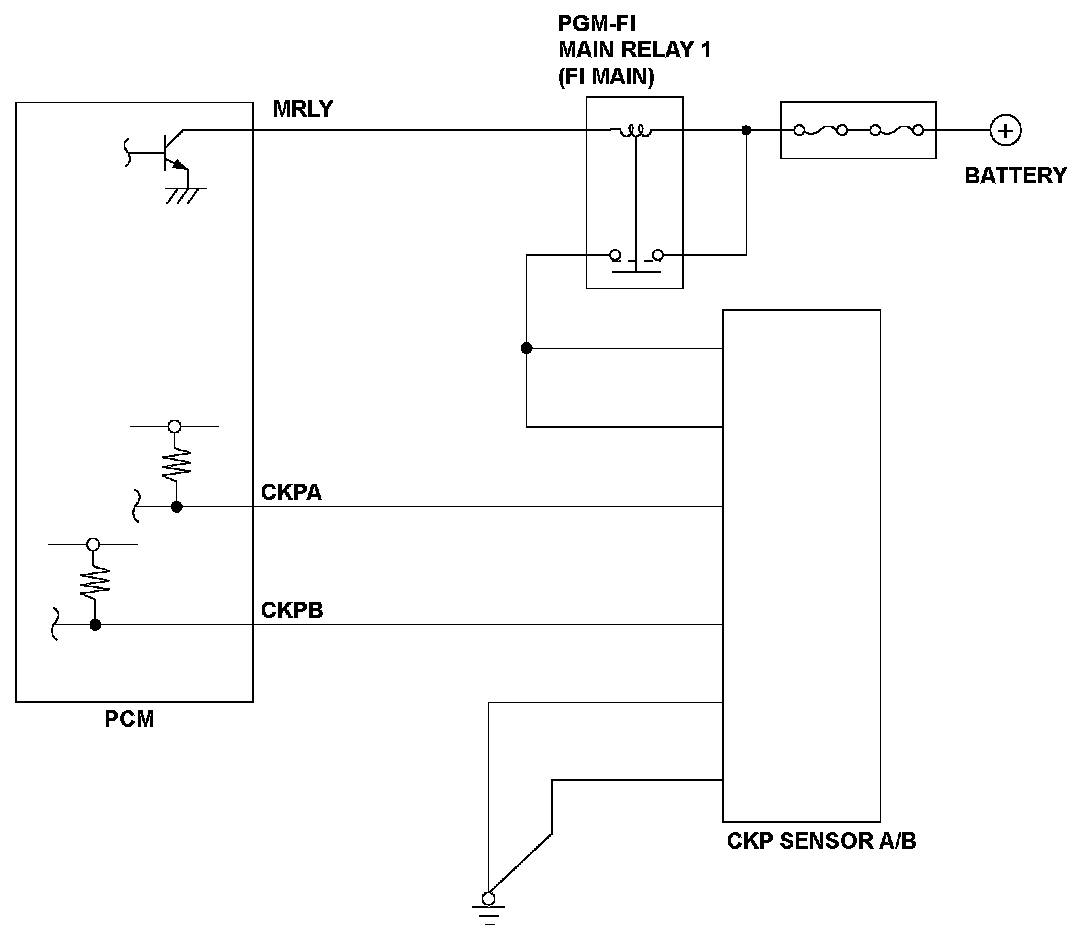 Crankshaft position (CKP) sensor A consists of a rotor and a semiconductor that detects rotor position. When the engine starts, the rotor turns and the magnetic flux in the semiconductor device changes. The changes of magnetic flux are converted into pulsing signals to the powertrain control module (PCM). CKP sensor A detects injection/ignition timing for each cylinder and engine speed. If no pulsing signals are detected from CKP sensor A, a malfunction is detected and a DTC is stored.