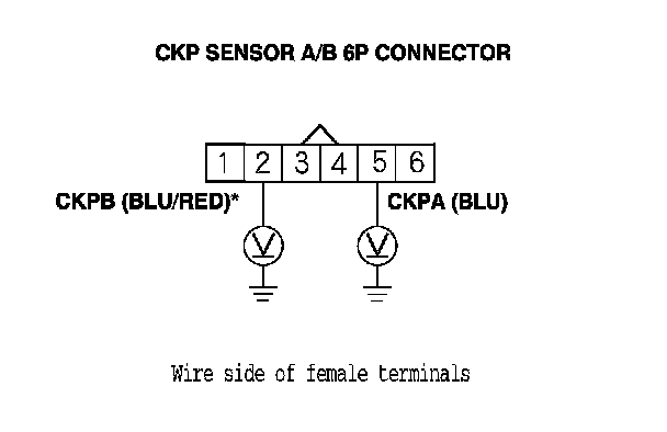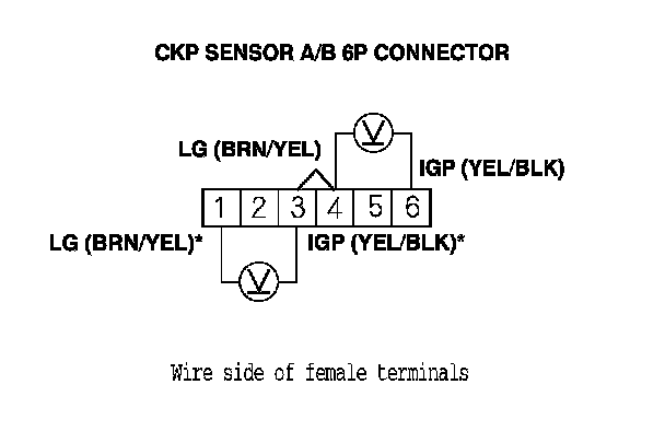 10. Measure the voltage between CKP sensor A/B 6P connector terminals No. 4 (No. 1)* and No. 6 (No. 3)*.
