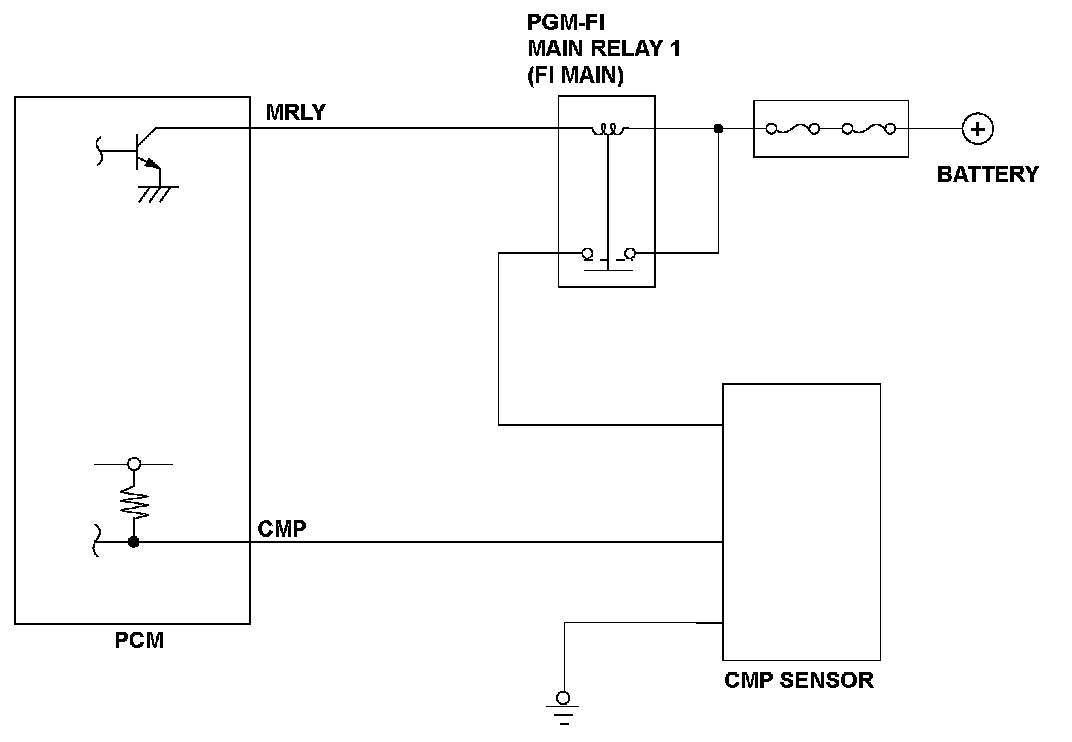 The camshaft position (CMP) sensor detects the intake camshaft timing and sends pulsing signals to the powertrain control module (PCM). The PCM determines the camshaft position according to the signals from the crankshaft position (CKP) sensor and the CMP sensor. If no pulsing signals are detected from the CMP sensor, the PCM detects a malfunction and stores a DTC.