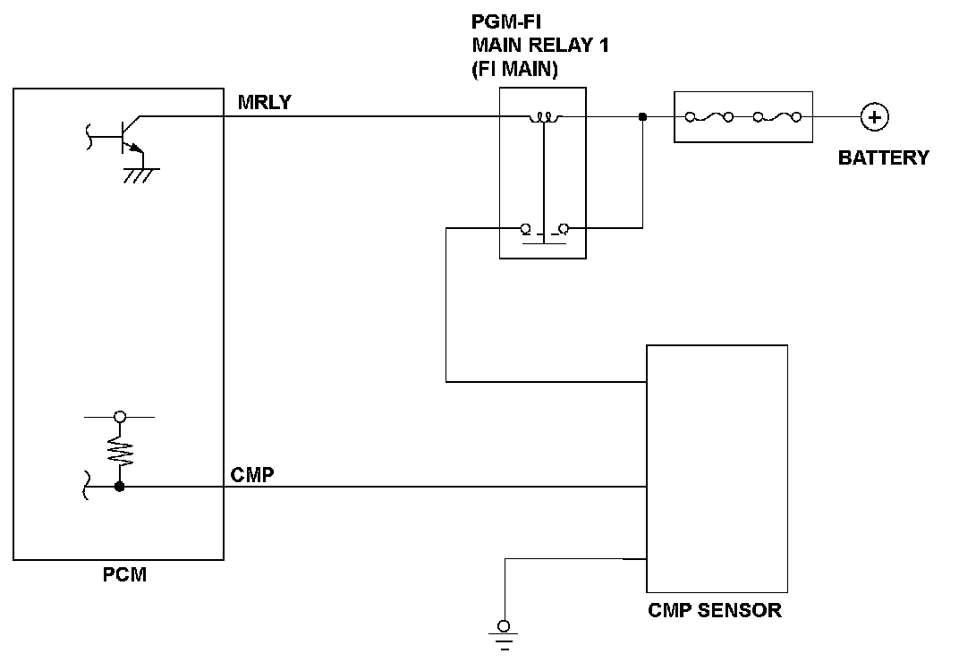 The camshaft position (CMP) sensor detects the intake camshaft timing and sends pulsing signals to the powertrain control module (PCM). The PCM determines the camshaft position according to the signals from the crankshaft position (CKP) sensor and the CMP sensor. If the number of pulsing signals from the CMP sensor during intervals between the CKP standard pulses is other than the proper number, the PCM detects a malfunction and stores a DTC.