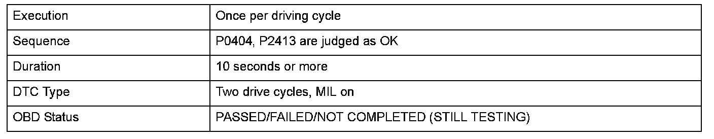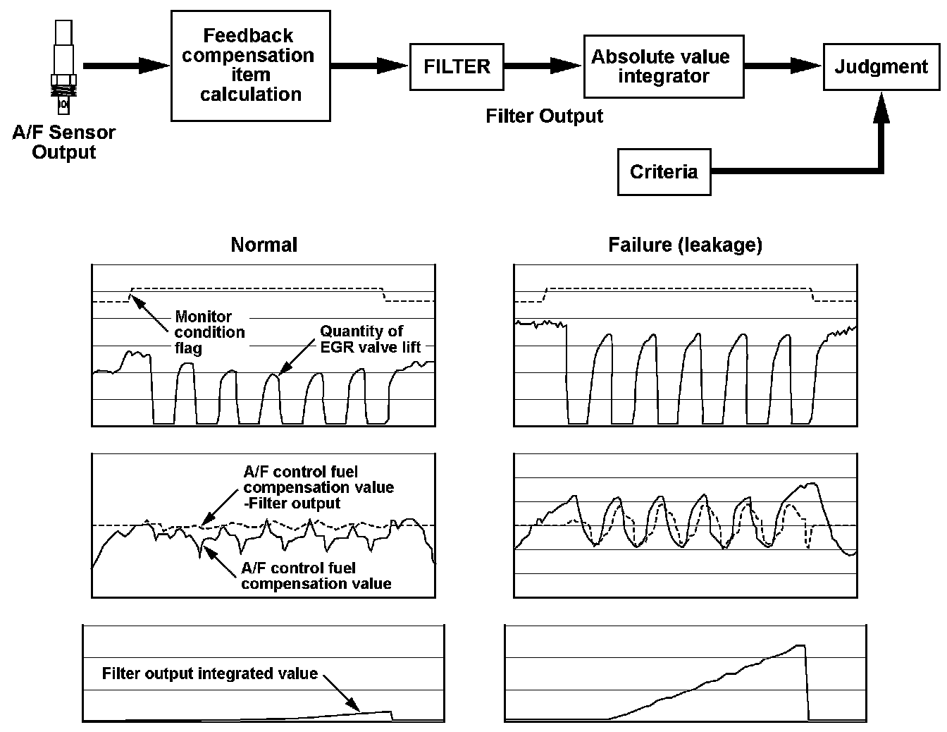 The exhaust gas recirculation (EGR) deterioration failure conditions include a sticking lift sensor, restricted passages, and leakage from the external piping. At any specific EGR lift value there is a corresponding A/F compensation value. If the A/F compensation value is greater than the corresponding EGR lift value, the powertrain control module (PCM) detects a malfunction and stores a DTC.