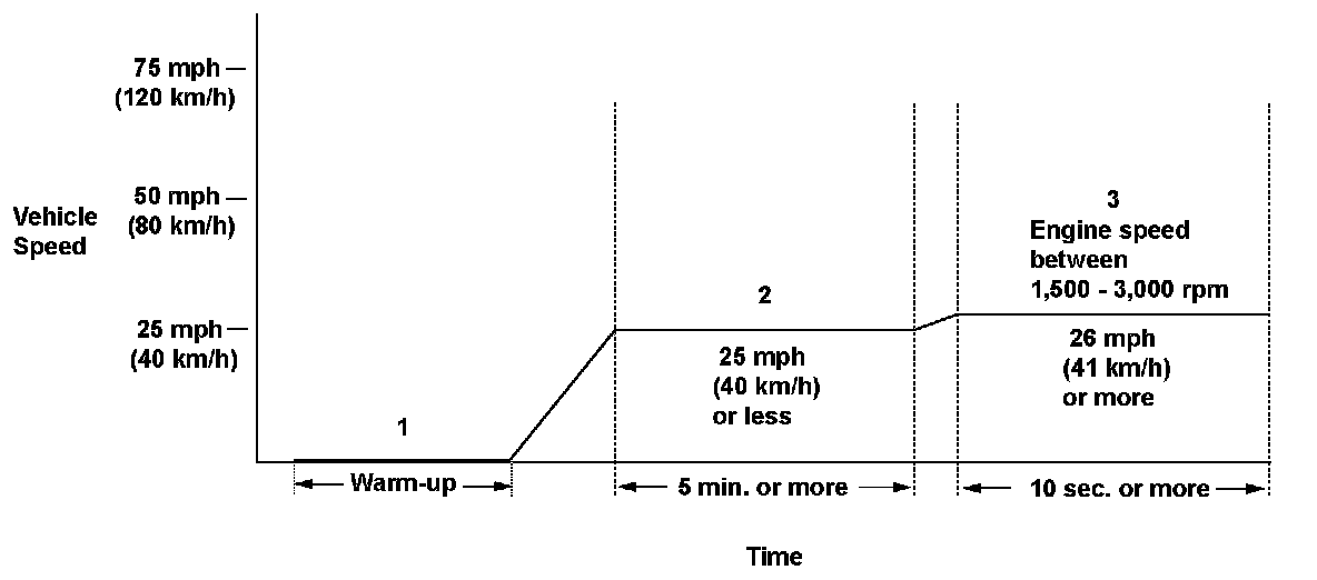 3. Drive immediately at a steady speed 26 mph (41 km/h) or more and engine speed between 1,500 - 3,000 rpm for at least 10 seconds.