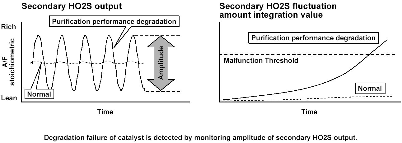 The three way catalytic converter (TWC) converts hydrocarbons (HC), carbon monoxide (CO), and oxides of nitrogen (NOx) in the exhaust gas to water vapor, carbon dioxide (CO2), and dinitrogen (N2). The powertrain control module (PCM) fluctuates the air/fuel ratio (A/F) temporarily to detect the performance of the TWC and measures the degree of fluctuation in the secondary HO2S output. If the accumulated value for a set time is too great, deterioration of the performance of the catalyst is detected.