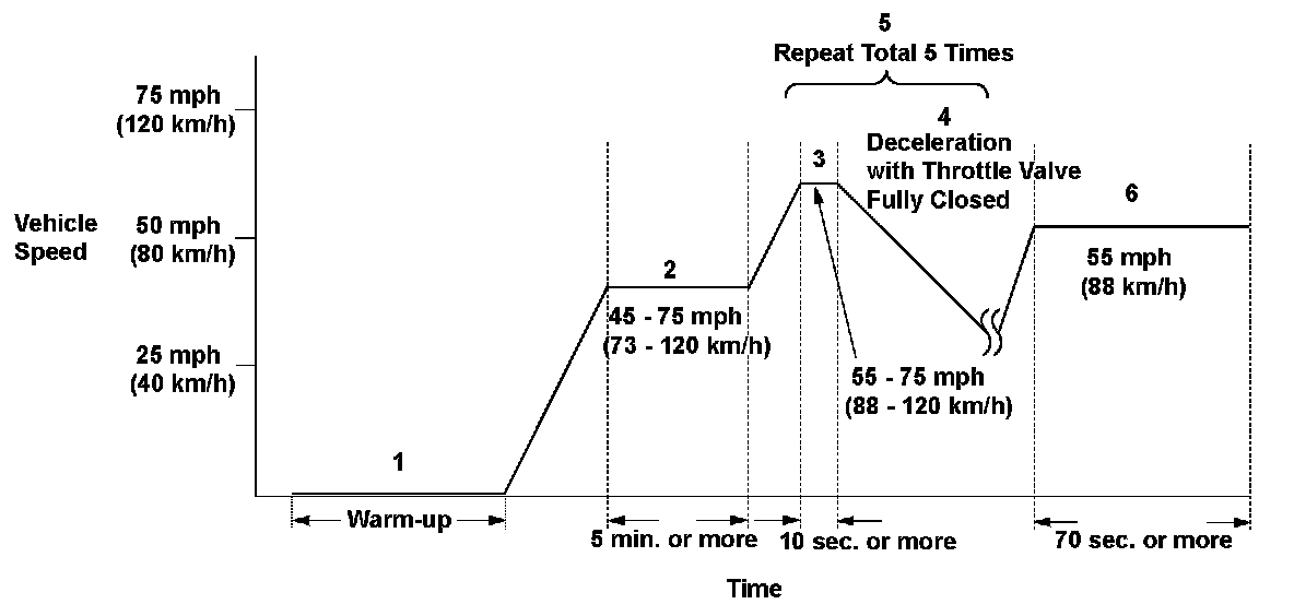 2. Drive the vehicle at a speed between 45 - 75 mph (73 - 120 km/h) for at least 5 minutes, to warm up the TWC.