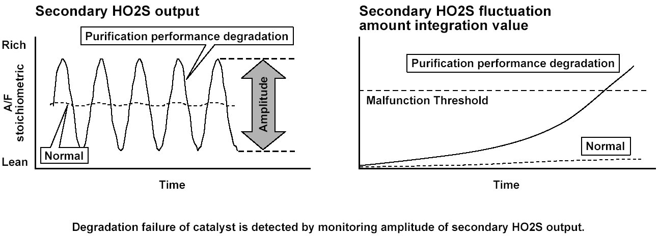 The three way catalytic converter (TWC) converts hydrocarbons (HC), carbon monoxide (CO), and oxides of nitrogen (NOx) in the exhaust gas to water vapor, carbon dioxide (CO2), and dinitrogen (N2). The powertrain control module (PCM) fluctuates the air/fuel ratio (A/F) temporarily to detect the performance of the TWC and measures the degree of fluctuation in the secondary HO2S output. If the accumulated value for a set time is too great, deterioration of the performance of the catalyst is detected.
