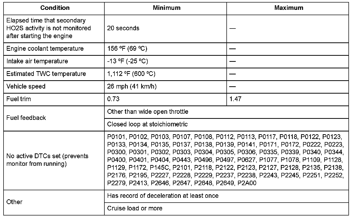 The secondary HO2S fluctuation integration value is 3.0 V or more for at least 9.5 seconds.