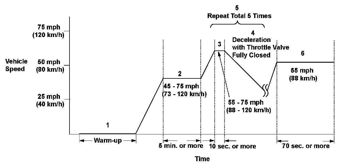 2. Drive the vehicle at a speed between 45 - 75 mph (73 - 120 km/h) for at least 5 minutes, to warm up the TWC.