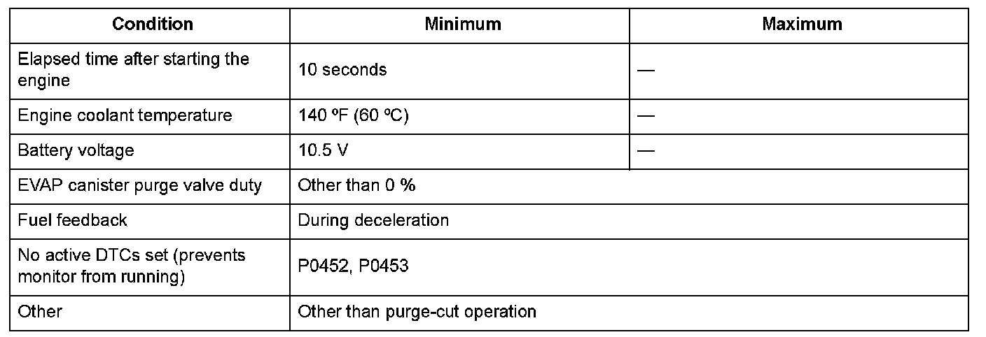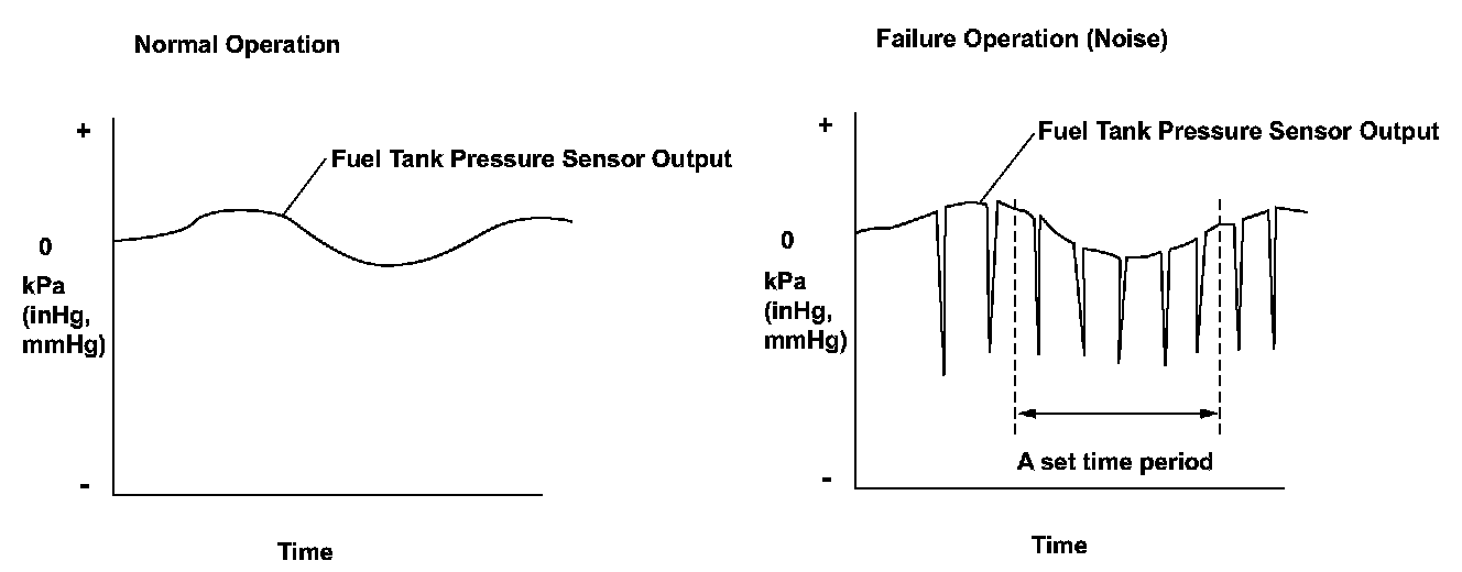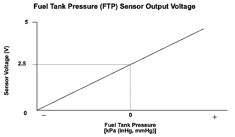 The fuel tank pressure (FTP) sensor is installed on the evaporative emission (EVAP) canister. The FTP sensor is used to detect leaks in the EVAP system. The powertrain control module (PCM) monitors the FTP sensor output voltage. The FTP sensor output voltage rises as the fuel tank pressure increases. Conversely, the FTP sensor output voltage drops as the fuel tank pressure decreases. Rapid changes in the FTP sensor output voltage due to electrical noise or an intermittent open during the EVAP leak detection may cause incorrect leak detection, so abnormal output is monitored. If the FTP sensor output voltage change occurs for specified ratio within a set time, the PCM detects a malfunction and stores a DTC.