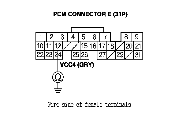 19. Check for continuity between PCM connector terminal E12 and body ground.