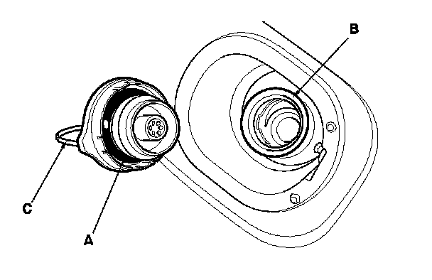 2. Check the fuel fill cap seal (A) and the fuel fill pipe mating surface (B). Verify that the fuel fill cap tether cord (C) is not caught under the cap.