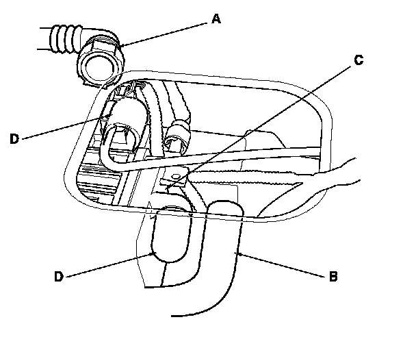 10. Disconnect the fuel tank vapor recirculation tube (A) and the fresh air hose (B) from the EVAP canister (C), and plug the EVAP canister port (D).