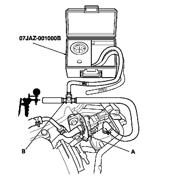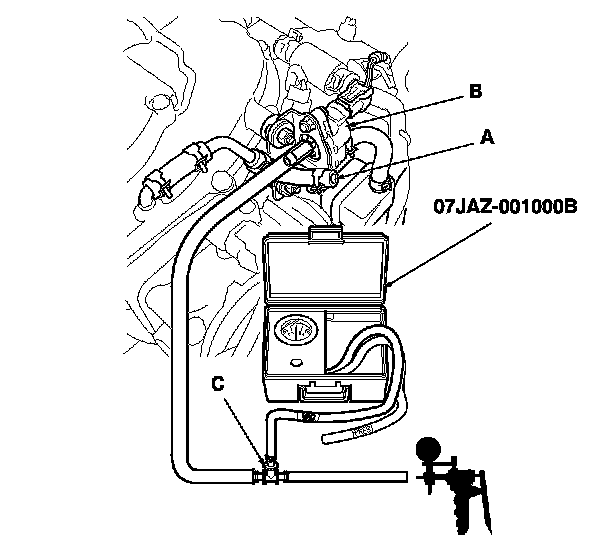 11. Disconnect the vacuum hose (engine side) (A) from the EVAP canister purge valve (B) in the engine compartment, and connect a T-fitting (C) from the vacuum gauge and the vacuum pump/gauge, 0-30 in.Hg, to the hose as shown.