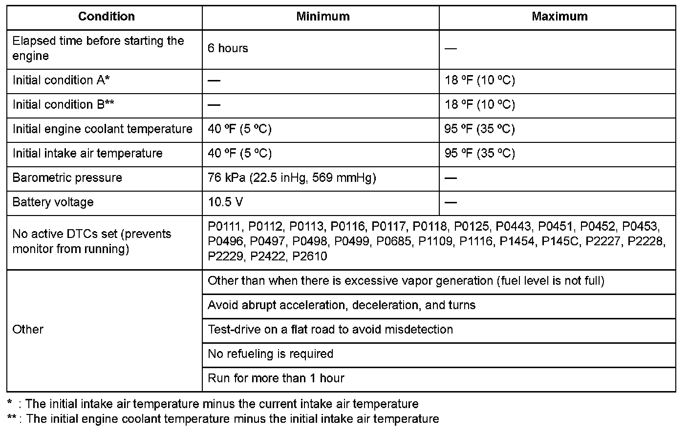 When a malfunction is detected during the first drive cycle with the ECT and IAT at engine start-up within the specified temperature range, a Pending DTC is stored in the PCM memory. If the malfunction returns in the next (second) drive cycle with the ECT and IAT at engine start-up within the specified temperature range, the MIL comes on and a Confirmed DTC and the freeze data are stored.