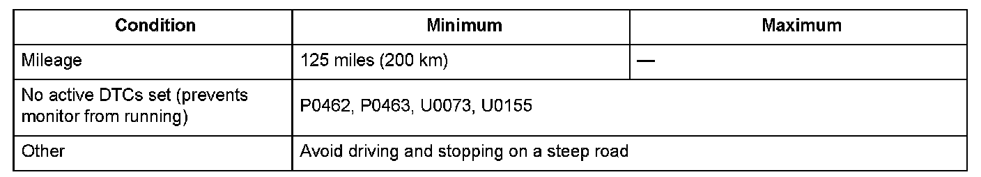 Drive for the specified mileage under Enable Conditions without refueling (turning the ignition switch to LOCK (0) is acceptable).